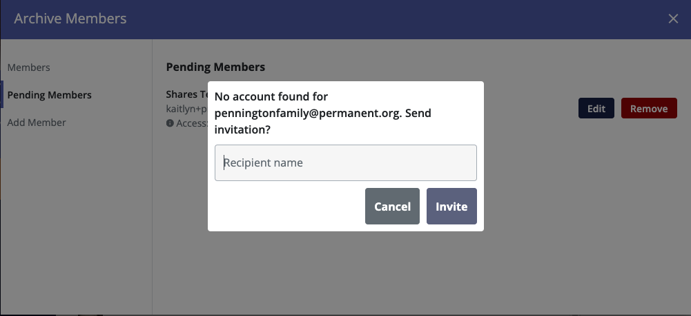 If the person you are inviting does not yet have an account on Permanent, you will see a new pop up confirming that you wish to send them an invitation to join Permanent. Enter the recipient's name, then click Invite. The person will receive an email inviting them to join Permanent, and once they create their account, they will be able to join your archive.