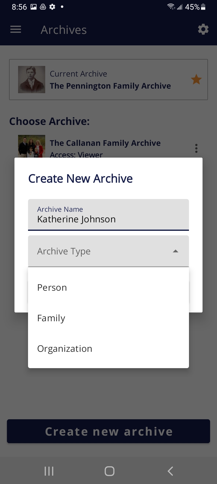 A person archive represents an individual person, such as yourself or someone else. A family archive is any group of people, such as a community group or a family. An organization archive is an organizational entity such as a company or nonprofit.