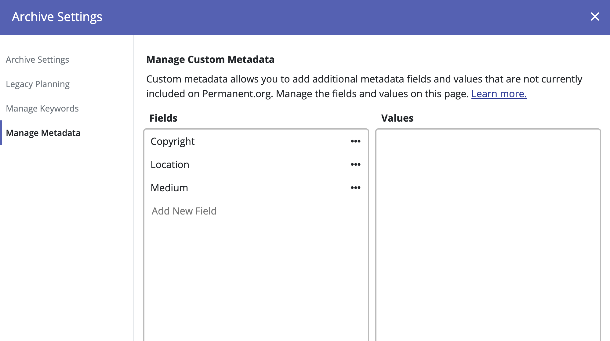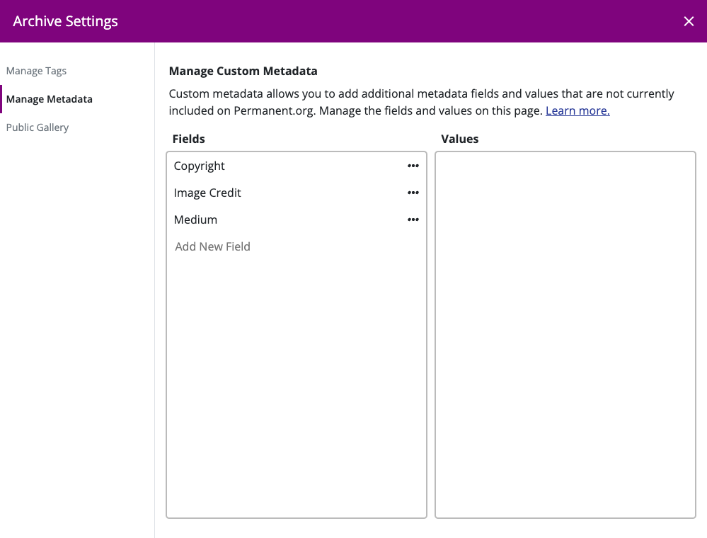 While Permanent.org has a number of metadata fields you can use to describe your files, Permanent.org now has the ability to add additional metadata fields using the Custom Metadata tagging feature.
