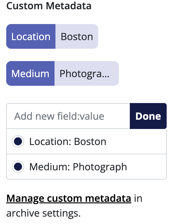If you wish to use that keyword again for another file, select the file then click under the Custom Metadata heading to open the Custom Metadata editor. Listed below the text box are all the Custom Metadata fields and values you've entered into your archive. Select the entry you wish to add by clicking the circle next to the custom metadata, and the custom metadata will be added to your file.