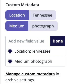 Type in the entire keyword you wish to add, including the field, a colon (:), and then the value (i.e. "Location:Tennessee"), then click Done. The custom metadata will be added to your file.