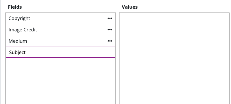 a "field:value" structure in keywords to designate an additional field or category (the field in the field:value pair) and the value of that field or category (the value in the field:value pair). This means you can add any additional metadata fields you'd like! For instance, you can use field:value pairs to add additional Dublin Core (a commonly used metadata standard for digital materials) metadata to your files. Learn more about using Dublin Core metadata on Permanent here.