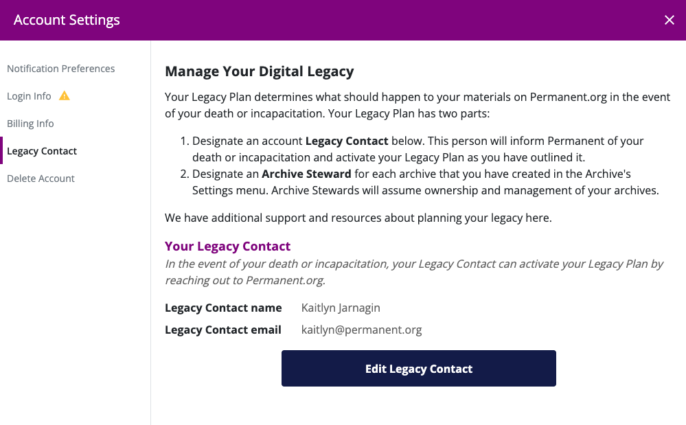 A Legacy Contact is the person who will reach out on your behalf to Permanent.org to let us know of your death or permanent incapacitation. This will activate the Legacy Plans you have created for the archives you own on Permanent.org. You only need to assign one Legacy Contact for your account.
