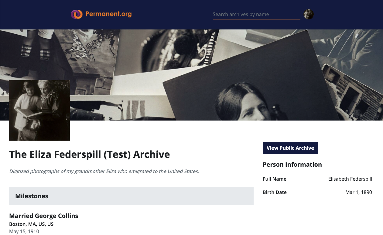 Your Archive Profile is where you can describe the person, organization, group, or family that your archive is about. Here, you can change the the name of the archive, add a biography, birth date and location, and list important dates, or milestones, related to the person, organization, or family. Fill out as much or as little information as you want, and select whether the information in the profile is public or private. Share your profile link with family and friends.