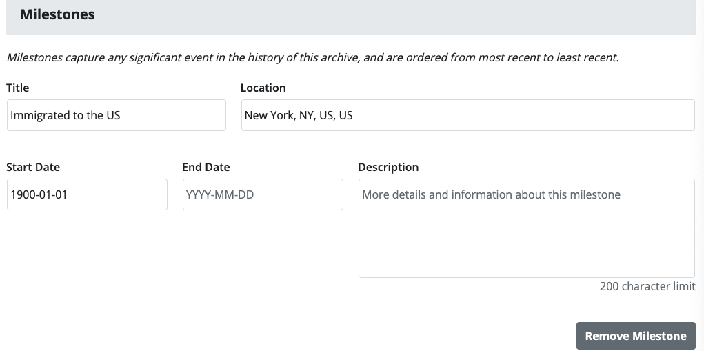 In the last section, you can add milestones about the person, family, or organization. Milestones capture any significant event in the history of the archive, and are ordered from most recent to least recent. You can add as many milestones as you wish by clicking the Add Milestone button, and you can remove milestones by clicking the Remove Milestone button.