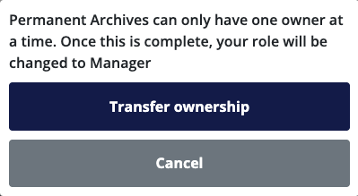 Once you have clicked "Ok," a pop up will appear that explains the transfer process. Your account will be demoted to a Manager of the archive, while the person you are inviting will become the Owner. You will retain ownership of the archive until the recipient joins the archive. If you would like to proceed with the transfer, click "Transfer ownership."