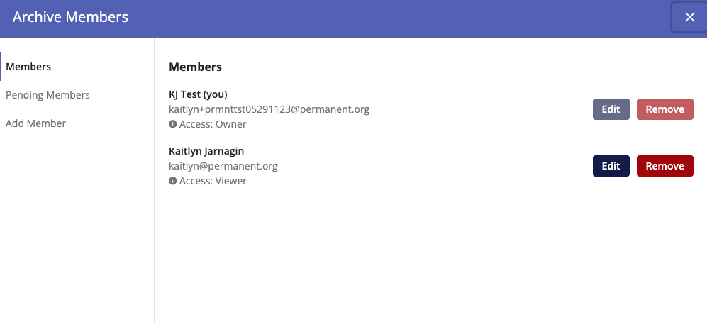 You'll now see their name and email in the Pending Members tab of the Archive Members manager. If you need to cancel the invitation, you can click the "Remove" button next to their name. Please note that at this time, you are unable to change the role of a pending archive transfer. If you decide to change the role of the person you invited, you will need to remove the transfer invitation and create a new invitation for their new access role.